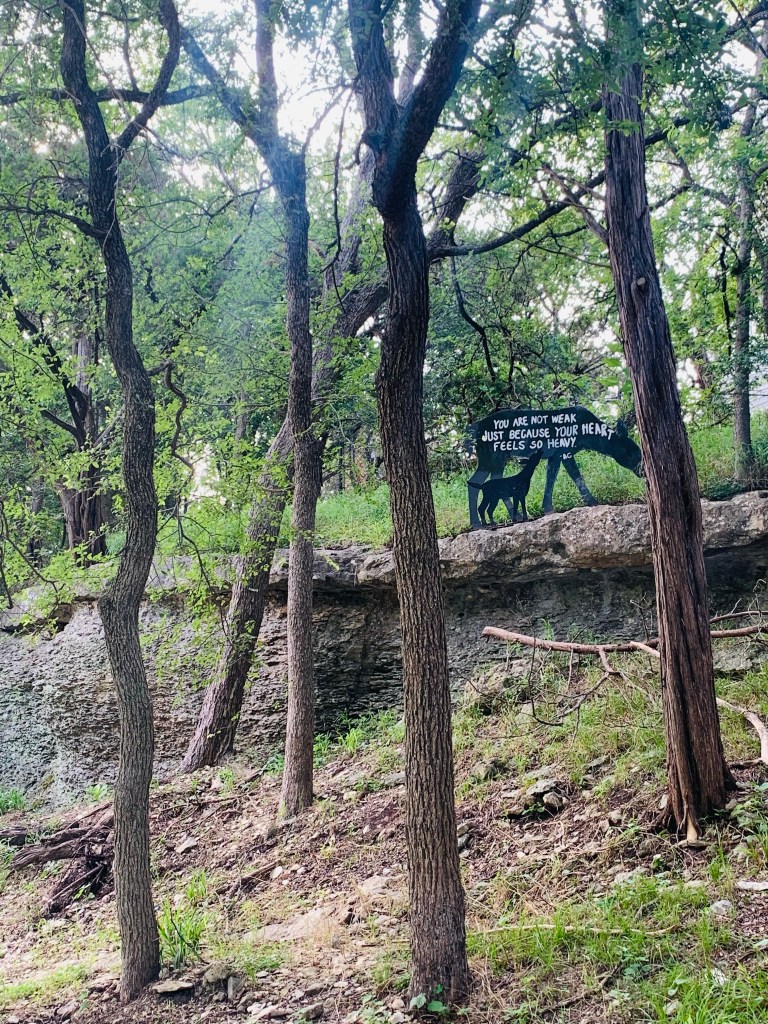 The park and greenbelt I was most excited about exploring when I moved here reminds me of the dryer parts of Texas that I grew up in. There are live oaks, sure, but there’s mostly scrub brush and non-native cedar, mesquite, cacti, grasses. Rabbits everywhere, little cottontails that freeze when they hear me walking, as to remain invisible. They leap and dash once they realize they’ve been seen, and I chuckle every time. The sign when entering the greenbelt says to keep cats indoors, dogs on leashes, and eyes open for coyotes. Thank goodness neither of my felines will ever have to worry about that.