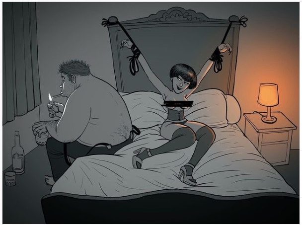 What struck me most is the comparison between he and she. Where her hair is nicely groomed, smooth and shiny, his is unkempt, swept up like he’s just awoken. Her skin is silky, his is rough, his face unshaven. She’s dressed with some effort and consideration, even wearing shoes in bed, while he is bulging out of his pants with his crack showing, not putting any thought into how he is presented. She is tiny in comparison to his hulking girth.