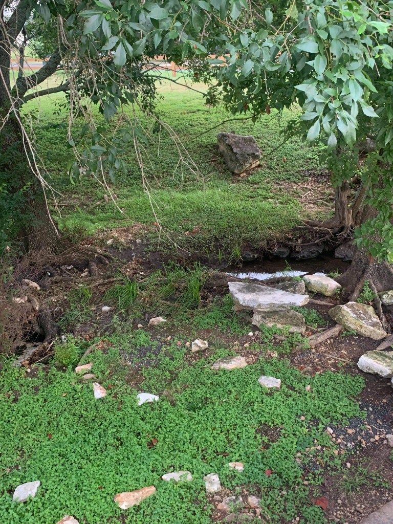The first time I walked the lush greenbelt a freshwater spring opened out of the grass, brazen as can be, shallow and small, winding a little stream to the main creek. I squealed in the discovery, and dipped my fingertips in her small pool, it was icy cool so I wet a handkerchief and wound it around my neck. Carrying something so small and sacred and secret felt like hiding from the houses around me, a little communion with our Mother, and I thanked her for the moment and for revealing the spring.